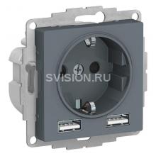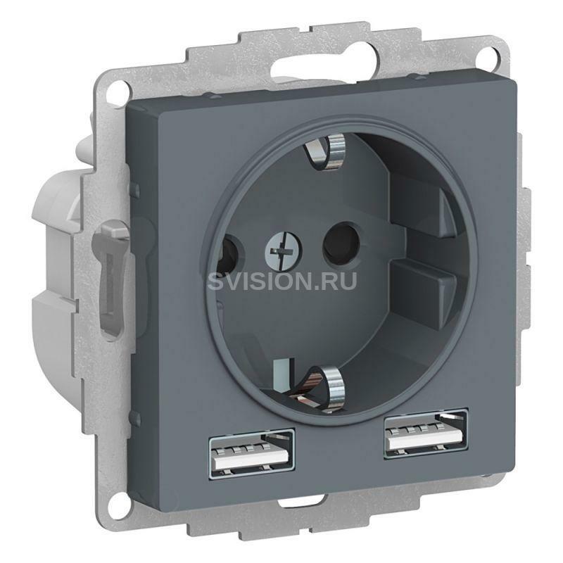 Описание Розетка 1-м СП AtlasDesign 16А IP20 с 2-мя заряд. устройствами USB тип A+A 5В/2.4А 2х5В/1.2А механизм грифель SE ATN000730