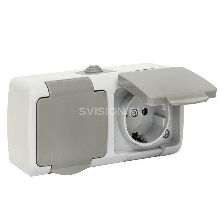Описание Розетка 2-м ОП Мурманск 16А IP54 с заземл. защ. шторки с крышкой сер. EKF EFR16-129-30-54
