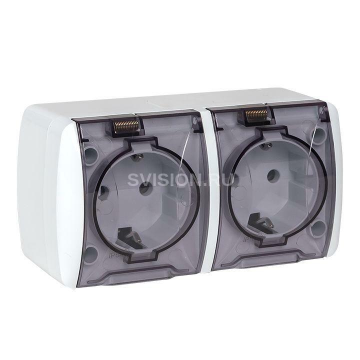 Описание Розетка 2-м ОП Владивосток 16А IP54 с заземл. с прозр. крышкой бел. EKF EQR16-129-30-54-T