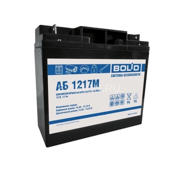 Болид АБ 1217М - аккумулятор свинцово-кислотный; 12В / 17 Ач; выводы Н-М5; срок службы 15 лет; 181х76х166 мм, 6.15 кг.