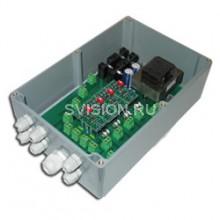 2-х канальный передатчик Себокс СУМ-2УСГК с блоком питани внешних камер, с грозозащитой укомплектован модулем видеопередатчиков (МСУ-1Г), предназначен для передачи видеосигналов от телекамер по кабелю типа “ ТПП-2х10х0.5 ” на расстояния до 1500 м. Конструктивно видеопередатчик выполнен в виде герметичного бокса с подогревом. На основании коробки, с помощью винтов крепится электронная плата состоящая из трансформаторного блока питания и модулей передачи видеосигнала по кабелю типа витая пара. Трансформаторный блок питания обеспечивает питание модуля передачи видеосигнала по кабелю типа витая пара (входное напряжение ~220В).