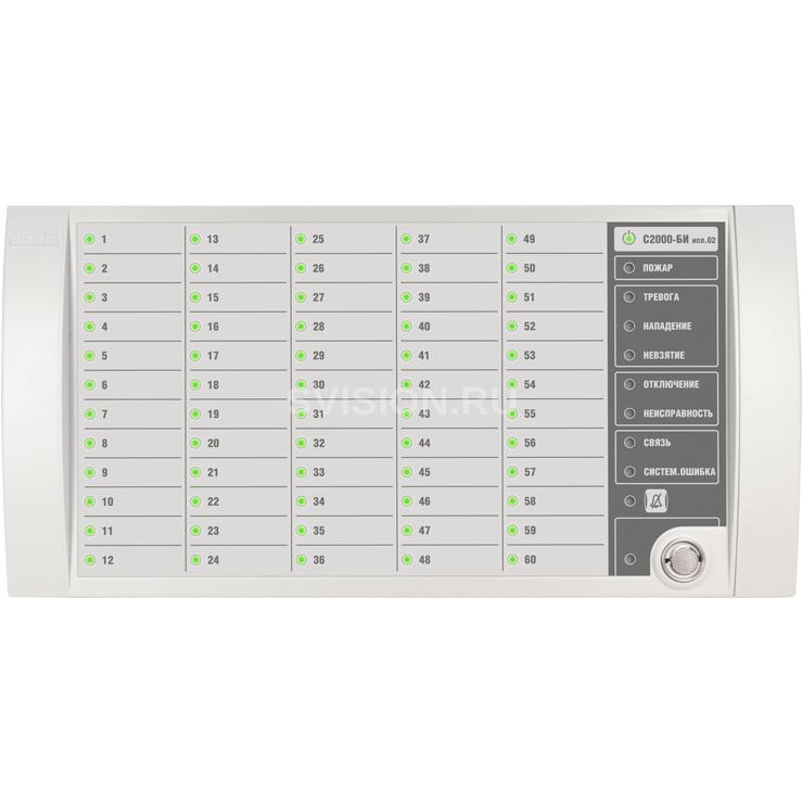 «С2000-БИ» исп.02 предназначен для работы в составе ИСО «Орион» совместно с пультом контроля и управления «С2000» («С2000М») и отображения с помощью встроенных индикаторов и звуковой сигнализации сообщений о событиях в 60 разделах системы.