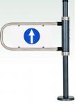 Калитка односторонняя левая, поворот дуги возможен против часовой стрелки при виде сверху, при попытке пройти в обратном направлении они представляют собой преграду. На пластиковой вставке односторонних калитки с одной стороны изображена стрелка, с другой стороны - знак запрета. Стойка - хромированная сталь, покрытие высокопрочной порошковой краской - цвет "серебряный антик".