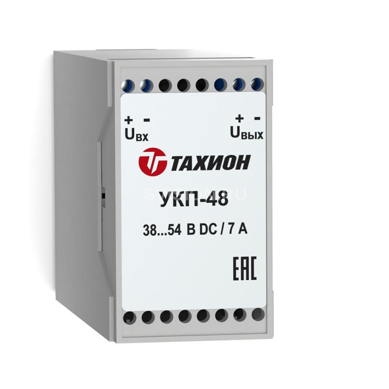 Устройство компенсации временного прерывания УКП-48. Устройство компенсации временного прерывания УКП-48 предназначено для поддержания на выходе блока переключения питания с зарядным устройством БПЗУ-48 (или аналогичного устройства бесперебойного питания) постоянного выходного напряжения 48 В в момент переключения контактов его реле, т.е. сведение к нулю времени прерывания питания при переходе на питание от АКБ. При этом напряжение на выходе изделия равно напряжению на входе. Изделие применяется для организации бесперебойного питания устройств, чувствительных к провалам напряжения при переключении с источника питания на АКБ. nnСтепень защиты в соответствии с ГОСТ 14254 IP20. Конструктивно изделие выполнено в пластмассовом корпусе с креплением на 35мм DIN-рейку. Изделие выпускается по техническим условиям ТУ 26.30.50-077-31006686-2017.