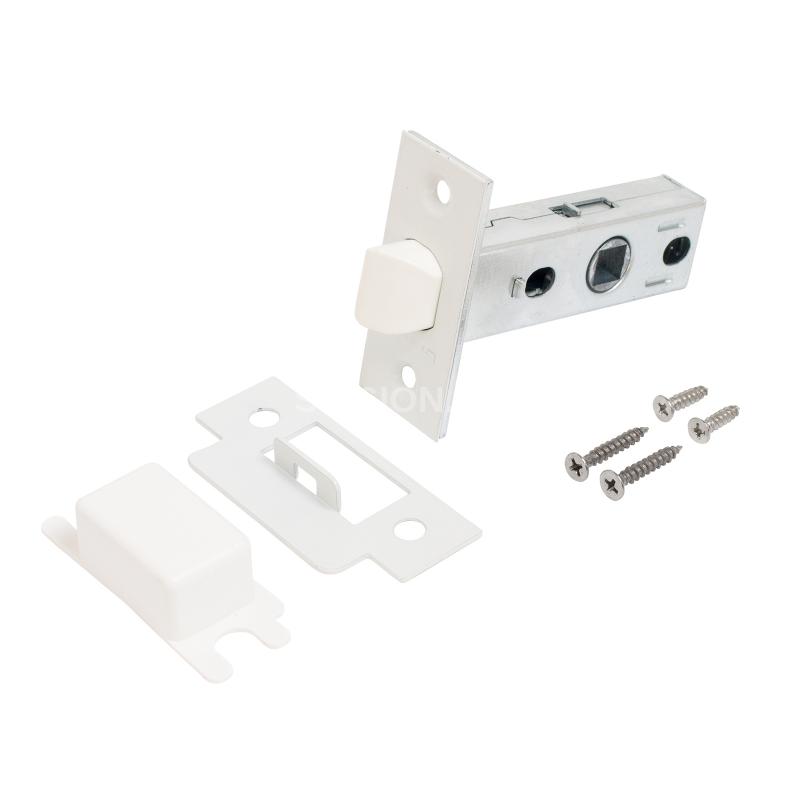 Универсальная защёлка врезная для установки на деревянные межкомнатные двери. Малошумный язычок защелки из ударопрочного пластика под цвет торцевой планки. Материал корпуса - сталь оцинкованная штампованная, гальваническое покрытие. Под ручку с квадратом 8 мм. Удаление ключевого отверстия - 45 мм. Ширина планки - 25мм. Габариты корпуса - 72.5х22х15 мм. В комплекте - защелка, ответная планка и белый пластиковый вкладыш к ней, саморезы.