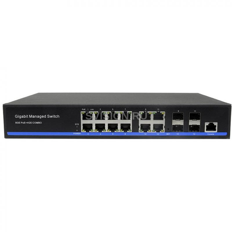 8 портов 100/1000 Мбит/с с поддержкой PoE+, автосогласованием и авто-MDI/MDIX (разъёмы RJ45) 4 порта Combo (100/1000Base-T/SFP) 10/100/1000 Мбит/с, автосогласованием авто-MDI/MDIX (разъёмы RJ45) Управление: