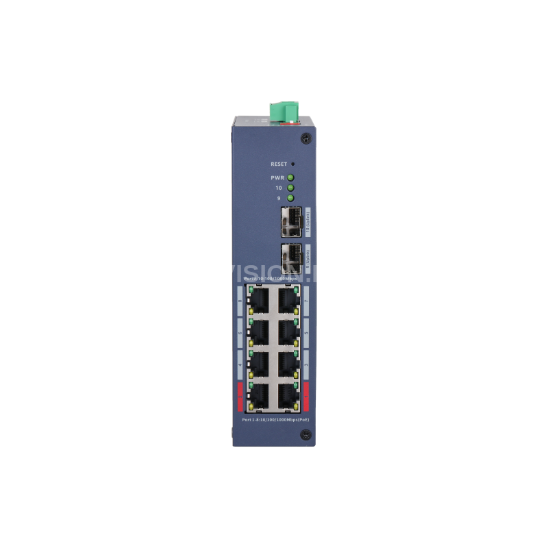 Порт 1–8: 8 × RJ-45 10/100/1000 Мбит/с (PoE) Порт 9–10: 2 × SFP 100/1000 Мбит/с (восходящий канал)