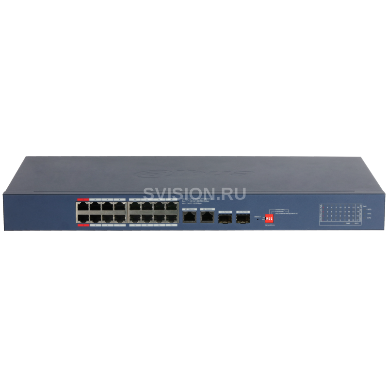16 × Гигабитных портов PoE RJ-45, 2 × Гигабитных порта RJ-45, 2 × гигабитных порта SFP.