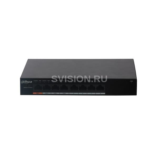 Dahua PFS3008-8ET-60 - это 8-портовый коммутатор Fast Ethernet, который поддерживает передачу данных и питания PoE на 250 метров. Оснащен четырьмя портами PoE 10/100 Мбит/с и четырьмя портами Ethernet 100 Мбит/с. Устройство поддерживает два режима передачи данных (по умолчанию / CCTV), которые управляются с помощью DIP-переключателя.