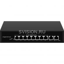 Модель имеет 8 основных PoE портов со скоростью передачи данных 10/100/1000 Мбит/c (порты с 7 по 8 поддерживают расширенный режим PoE до 250 метров на скорости 10 Мбит/с), 2 Uplink порта 1000 Мбит/c. Общий PoE-бюджет составляет 120 Вт.