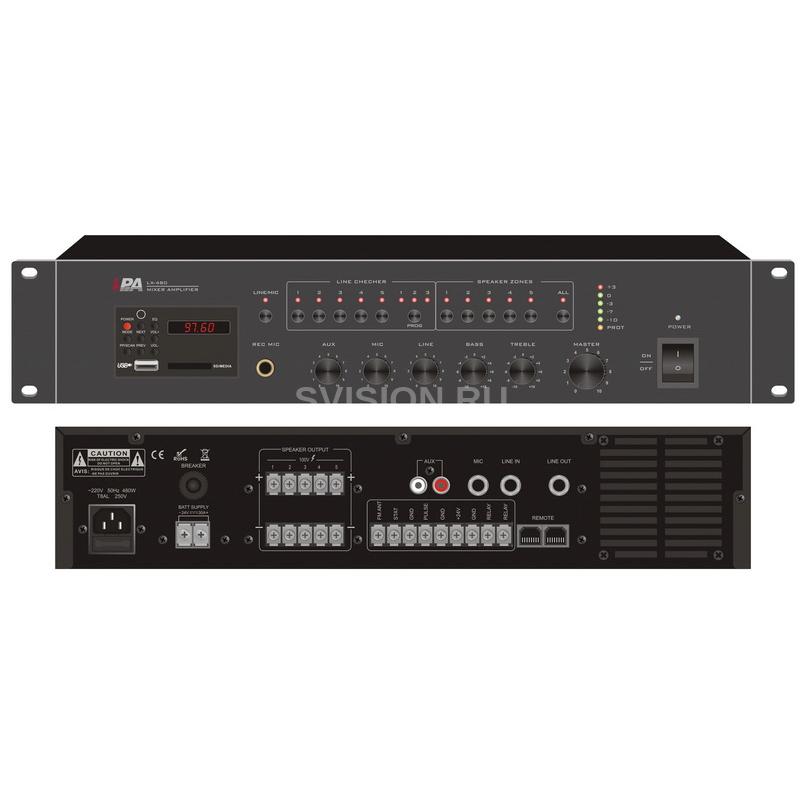 Микшер-усилитель LPA-LX480 объединяет в одном корпусе функции сразу нескольких устройств: трансляционного усилителя на 5 зон, микшера-предусилителя, блока контроля линий на 5 зон, блока цифровых сообщений, автоматического зарядного устройства, MP3-проигрывателя и FM-тюнера.
