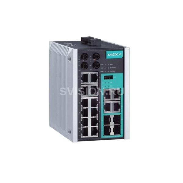 Промышленный 18-портовый управляемый коммутатор Moxa EDS-518E-MM-ST-4GTXSFP содержит: 12 портов 10/100 BaseT Ethernet, 4 комбо-порта Gigabit Ethernet (RJ-45 + SFP), 2 порта 100BaseFX (многомодовое волокно, разъем ST). Рабочая температура: от -10 до +60С.