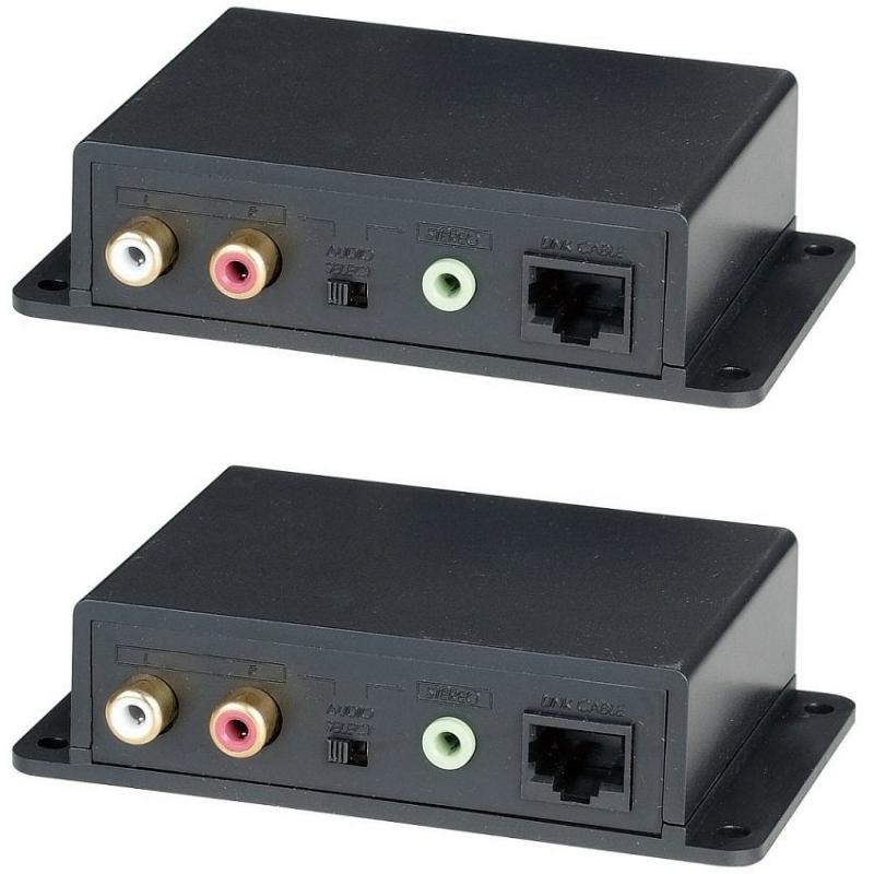 SC&T AE02 - комплект для передачи стерео аудиосигнала на расстояние до 600 м по кабелю витой пары. Встроенный изолятор. Два приёмопередатчика RCA, мини аудио разъём, переключатель разъёмов аудио. Не требует питания.